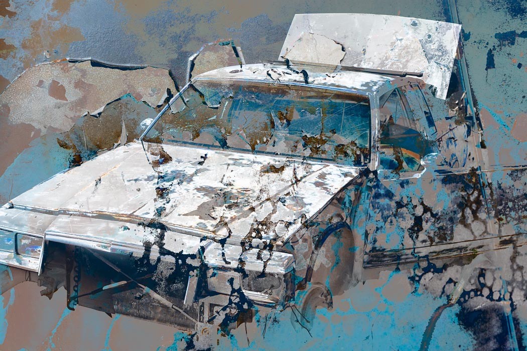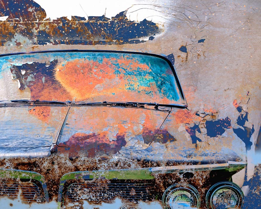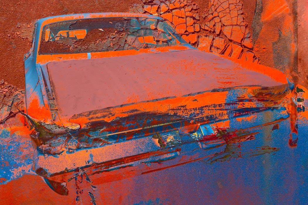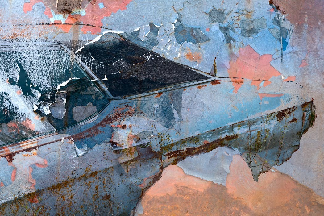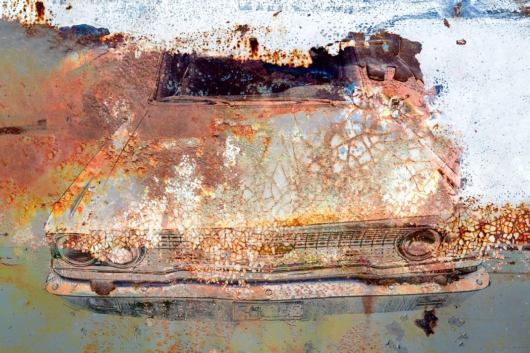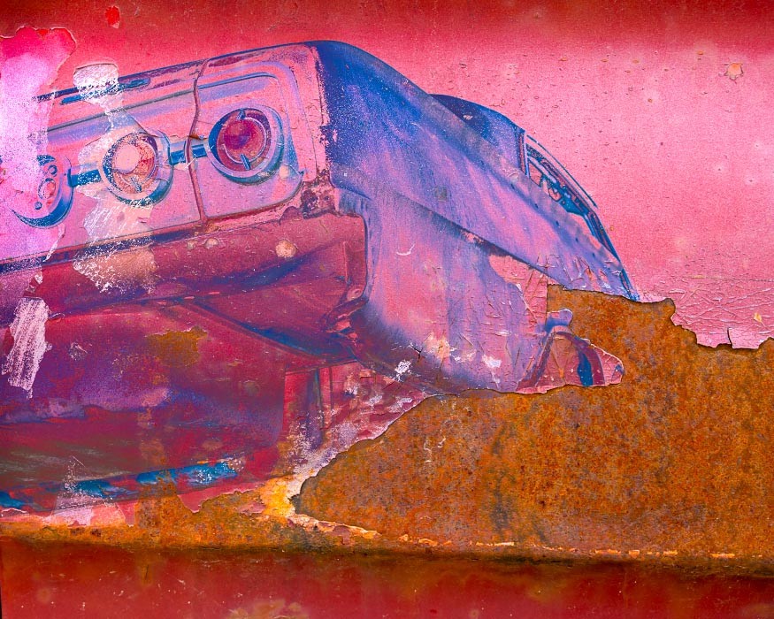 Capturing the source images for this mashup series was a literal fulfillment of the introductory statement on my website: “I’m an artist who finds as much joy roaming through a junk car lot as I do a picturesque landscape.” As an artist who sees beauty in decay, the cars become hidden treasure with their corroded metal and peeling paint. For some bonus content related to this series, check out Getting Up to Speed.