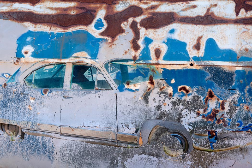 Detailing also takes on new meaning here. Zooming in magnifies the intensity of cracks and corrosion,transforming the works into rich textural compositions that verge on abstraction. Details often overlooked, such as door handles, chrome trim, and flakes of paint, move to center stage.