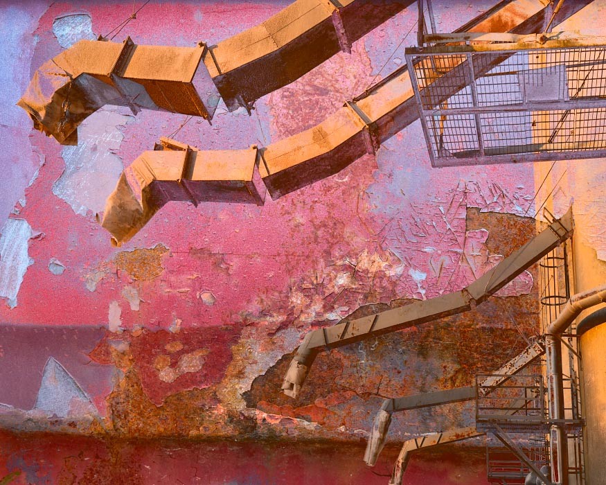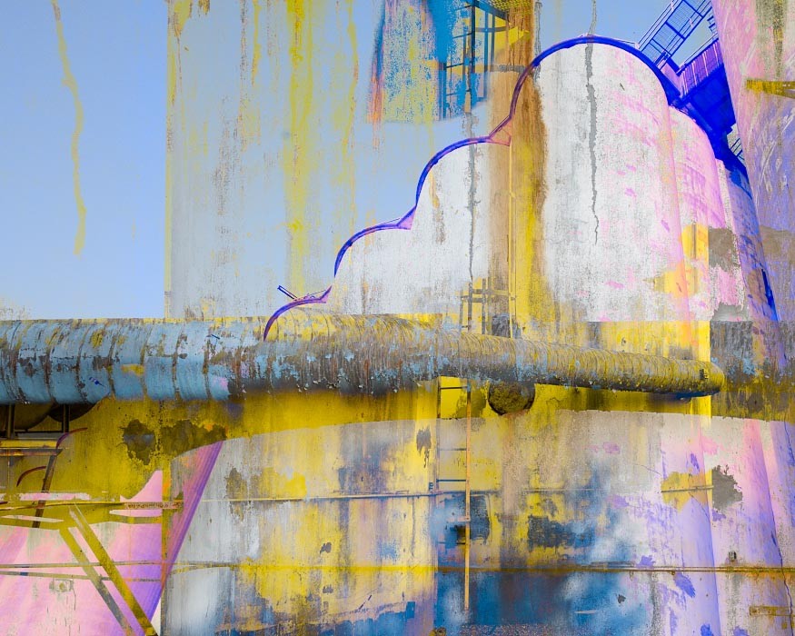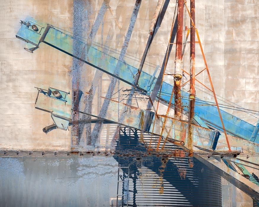 Along with barns, grain bins and elevators are a common sight dotting the Midwestern landscape. Within these functional but often overlooked industrial forms exist compositions, patterns and textures waiting to be reimagined. As with all my mashup art, this series explores the boundaries between realism and abstraction, and transforming the ordinary into something more surreal.