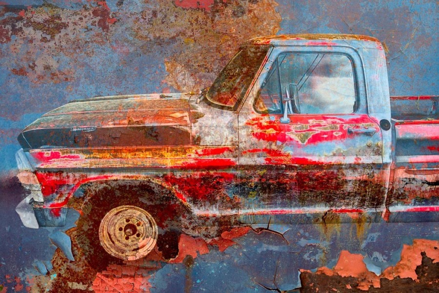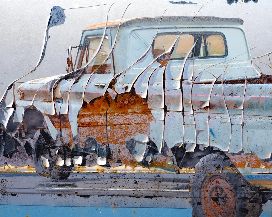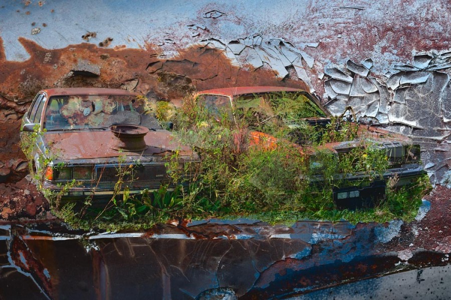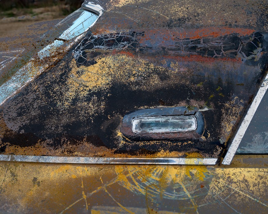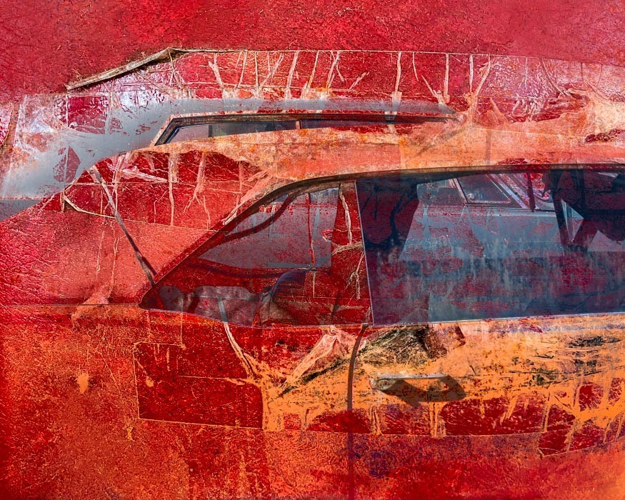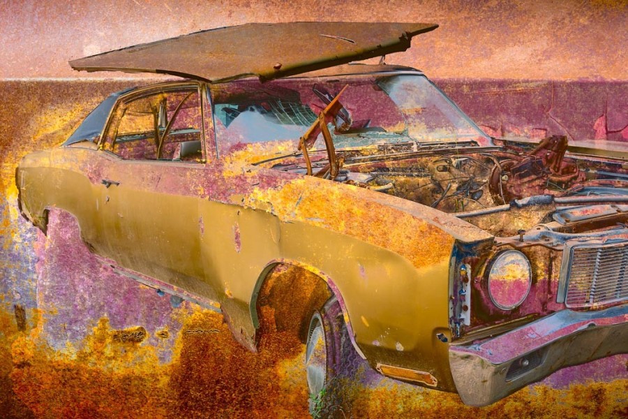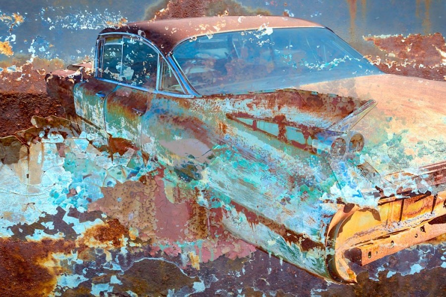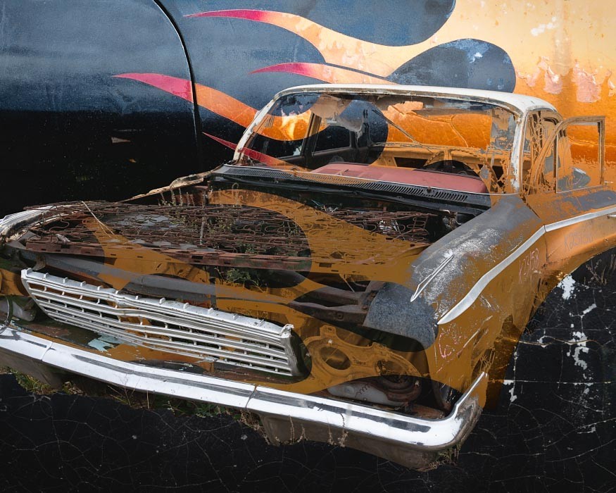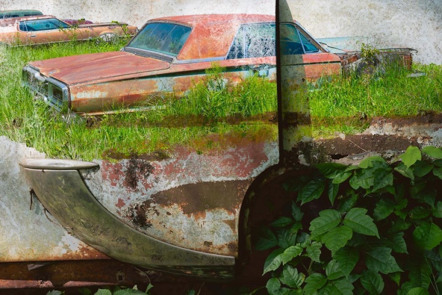 Capturing the source images for this mashup series was a literal fulfillment of the introductory statement on my website: “I’m an artist who finds as much joy roaming through a junk car lot as I do a picturesque landscape.” As an artist who sees beauty in decay, the cars become hidden treasure with their corroded metal and peeling paint. For some bonus content related to this series, check out Getting Up to Speed.