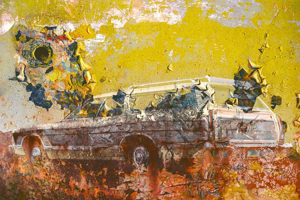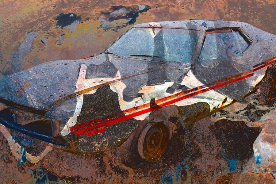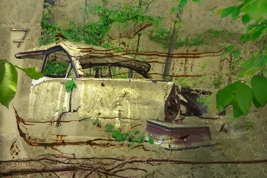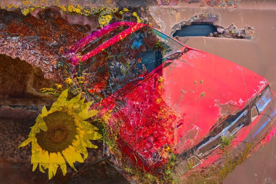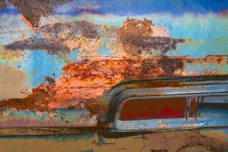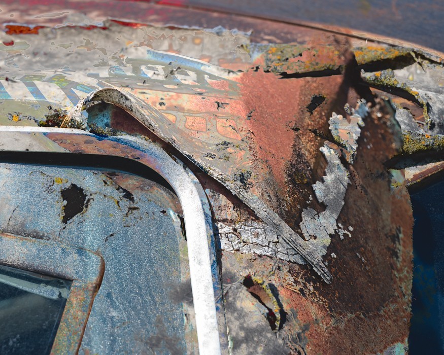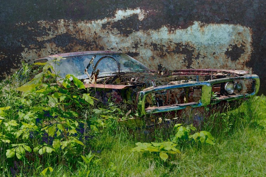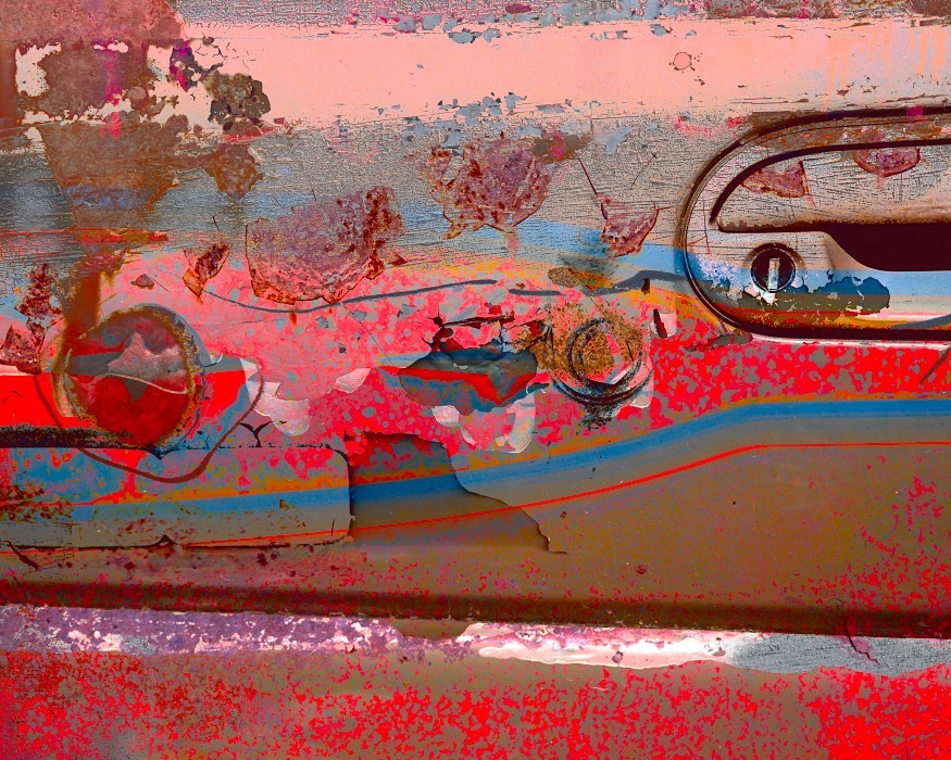 Capturing the source images for this mashup series was a literal fulfillment of the introductory statement on my website: “I’m an artist who finds as much joy roaming through a junk car lot as I do a picturesque landscape.” As an artist who sees beauty in decay, the cars become hidden treasure with their corroded metal and peeling paint. For some bonus content related to this series, check out Getting Up to Speed.