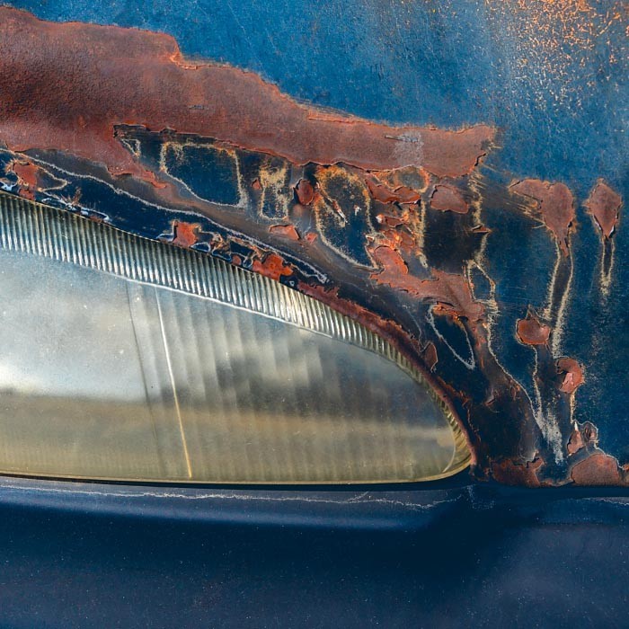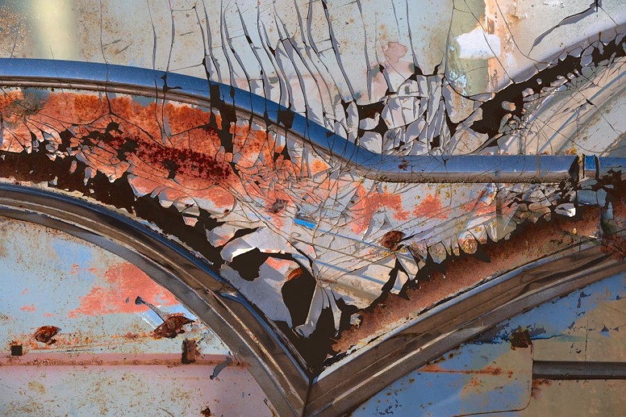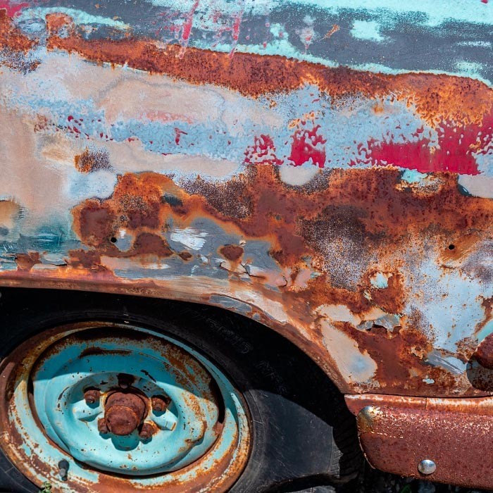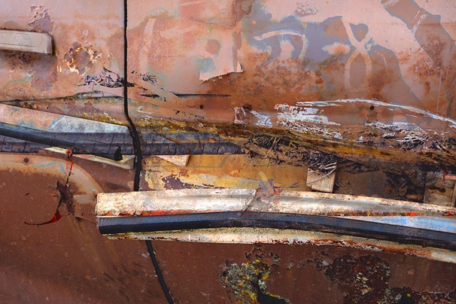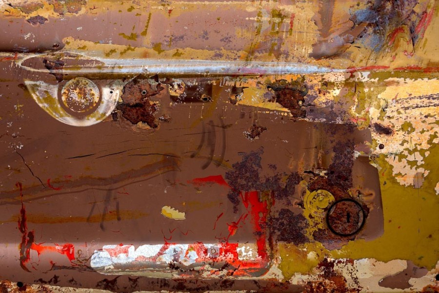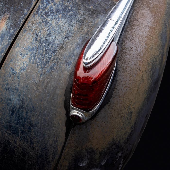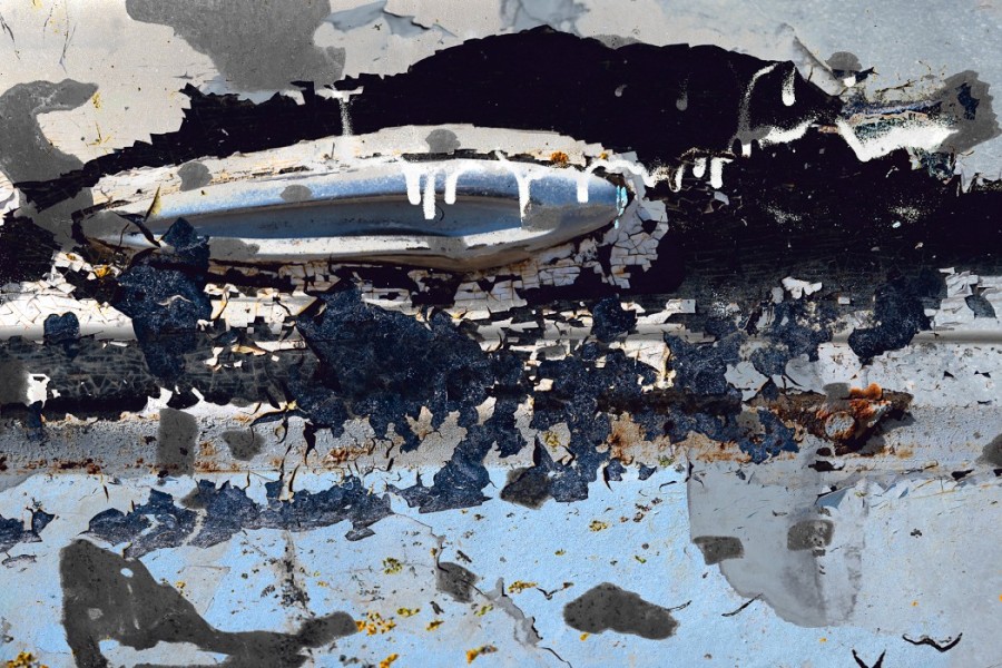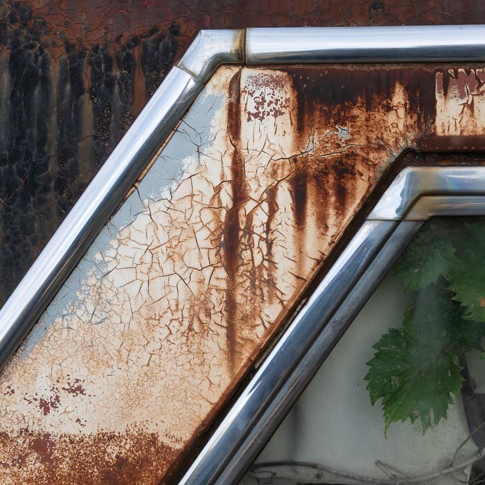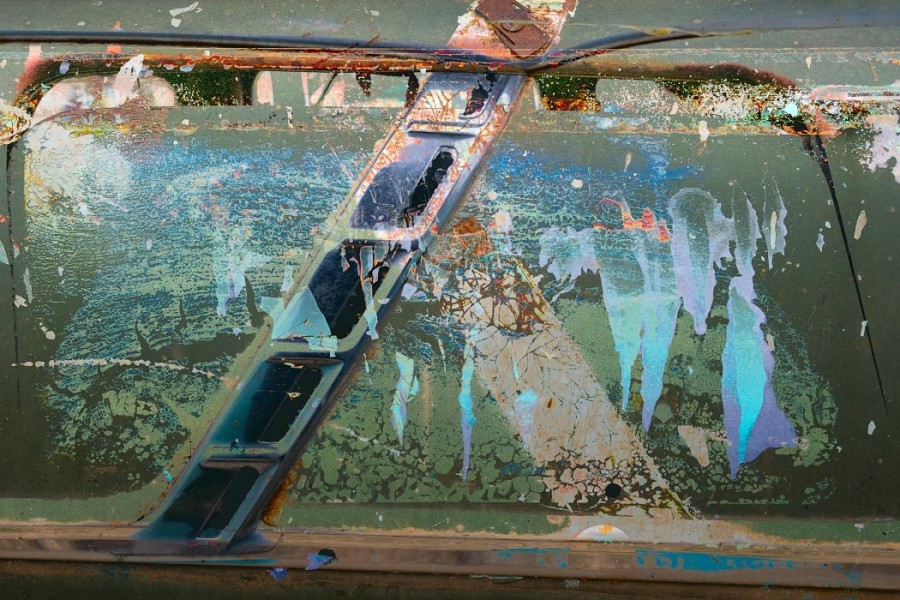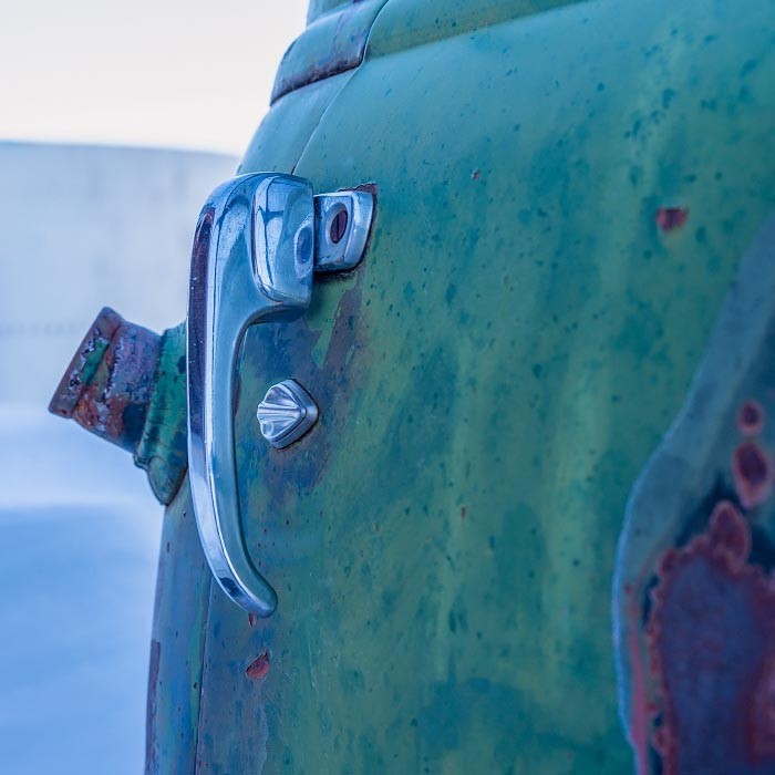 Detailing also takes on new meaning here. Zooming in magnifies the intensity of cracks and corrosion,transforming the works into rich textural compositions that verge on abstraction. Details often overlooked, such as door handles, chrome trim, and flakes of paint, move to center stage.