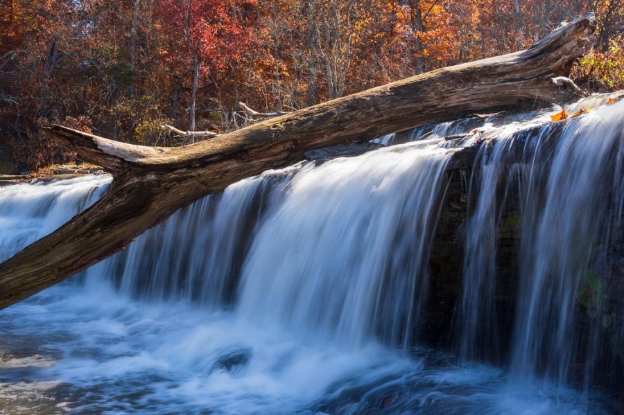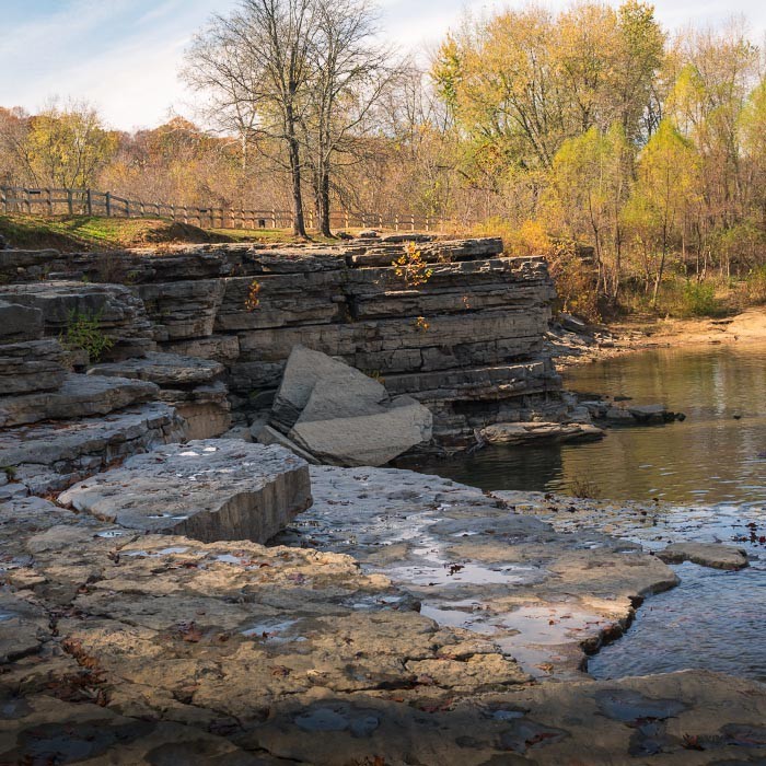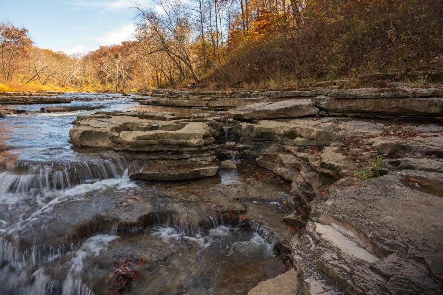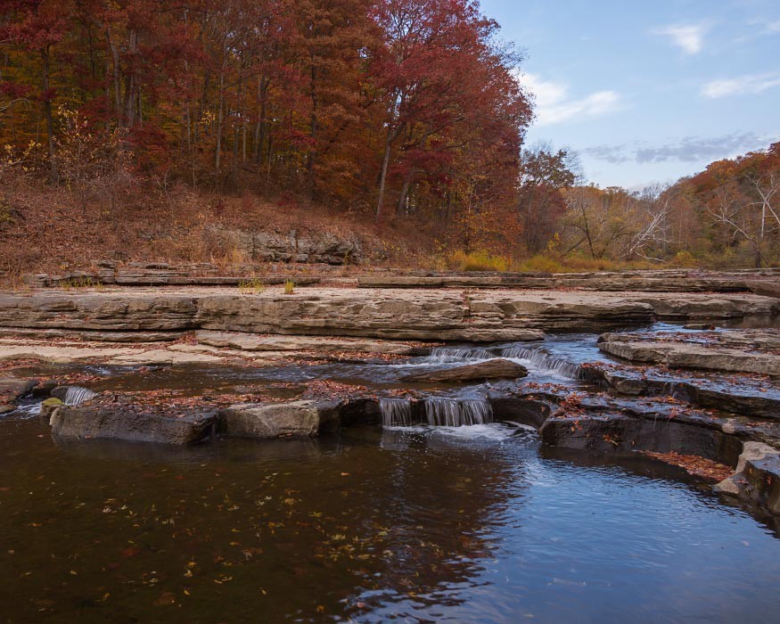 Cataract Falls is the largest waterfall in the state of Indiana by volume. It actually consists of two sets of waterfalls located about a mile apart. The combination of water effects, fall foliage, and limestone rock formations provided a great setting for photos.