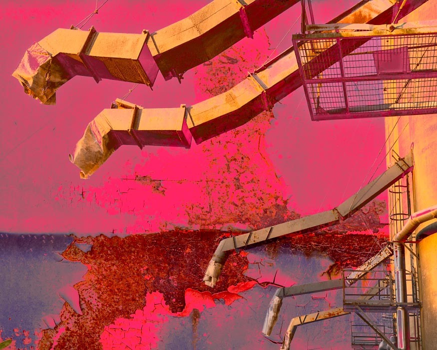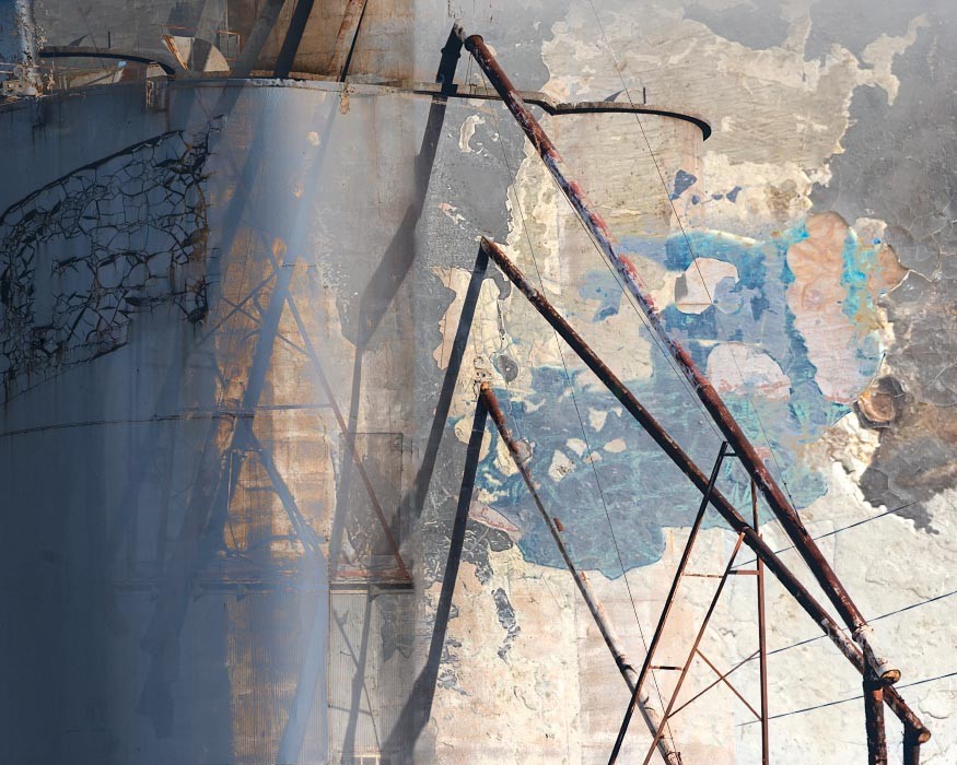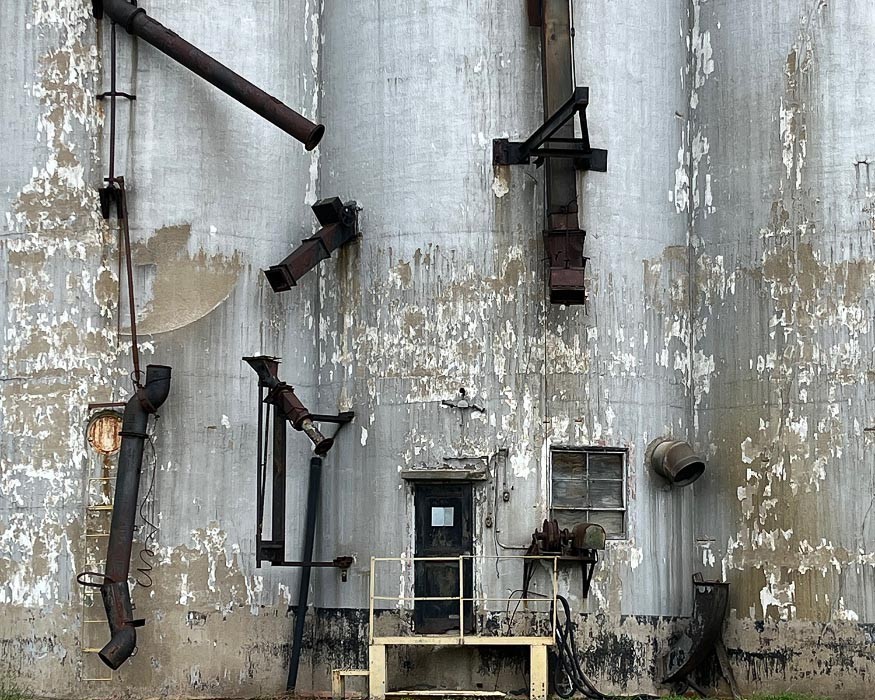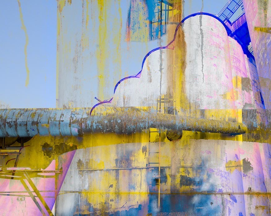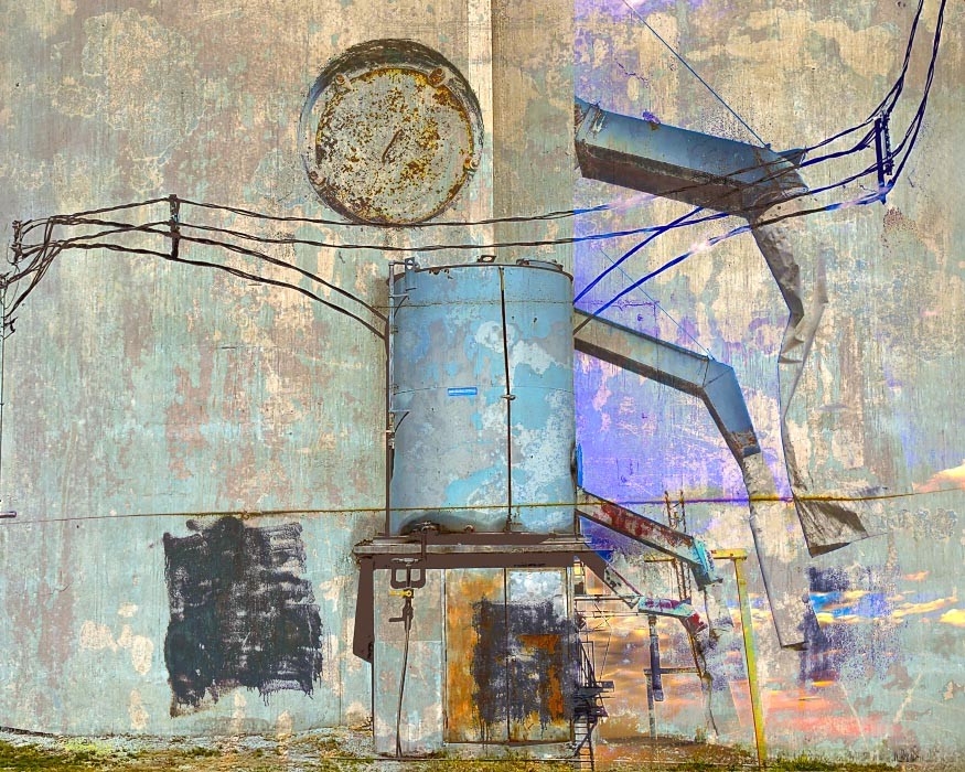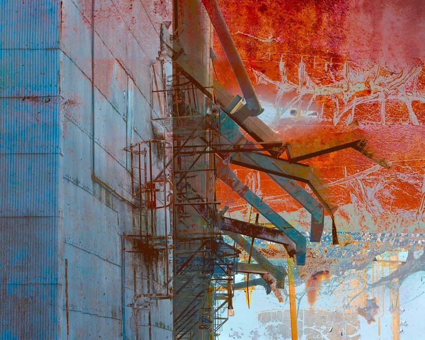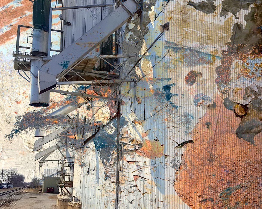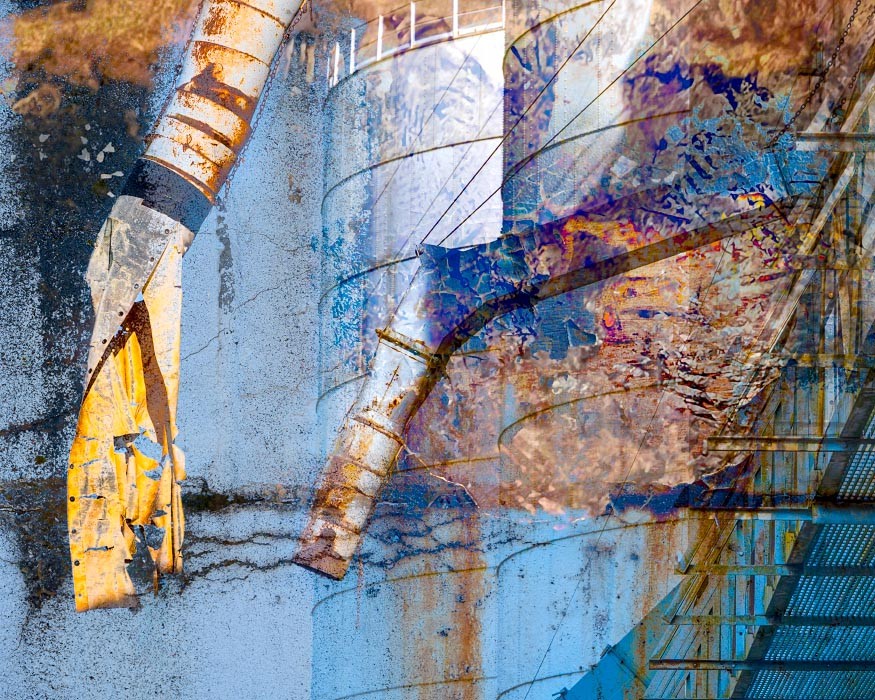 Along with barns, grain bins and elevators are a common sight dotting the Midwestern landscape. Within these functional but often overlooked industrial forms exist compositions, patterns and textures waiting to be reimagined. As with all my mashup art, this series explores the boundaries between realism and abstraction, and transforming the ordinary into something more surreal.