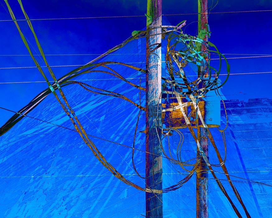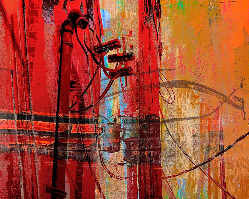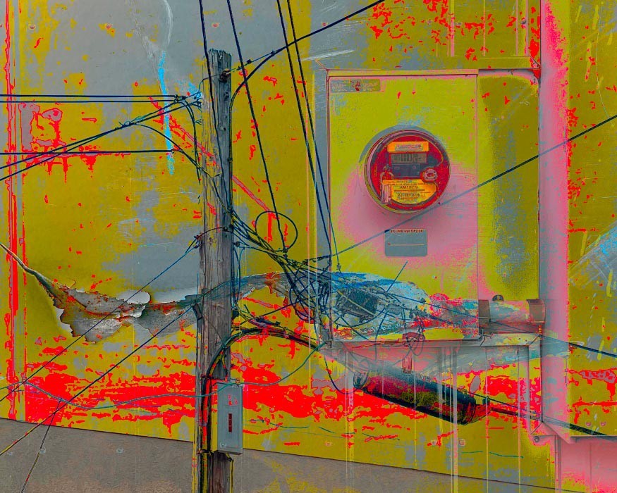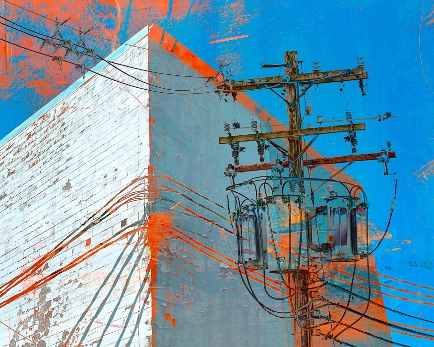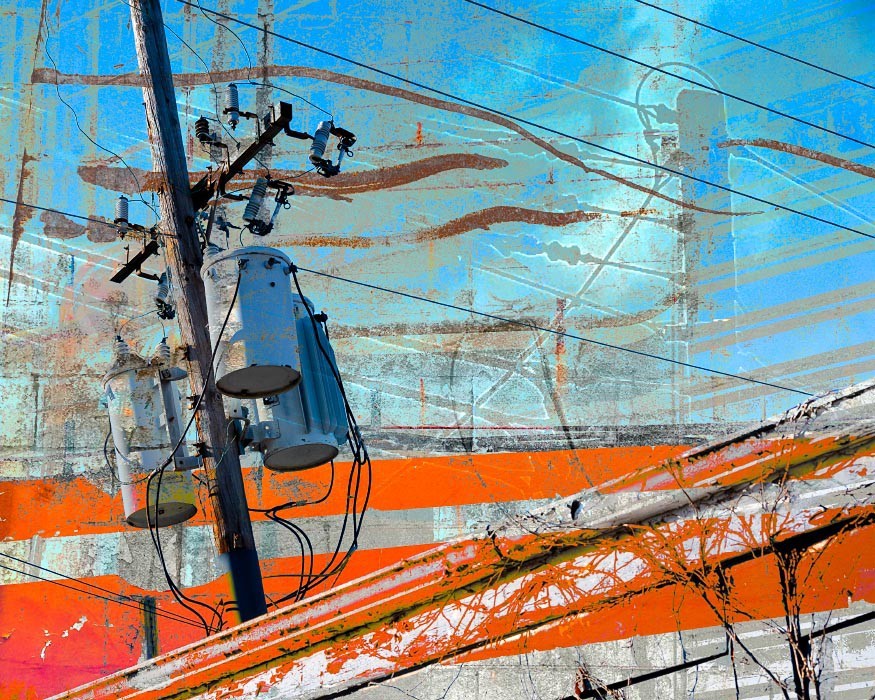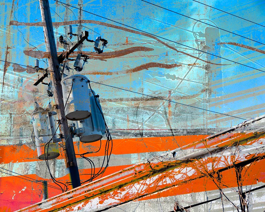 Electrical wires, poles, transformers, and other components that make up our power grids are everywhere around us, so common that it may come as a "shock" to use them as subject matter for artwork. For me though, tapping into the linearity of the wires and the opportunity to visually "charge" the works with texture and oversaturated colors became apparent. The somewhat apocalyptic effect of this mashup series as a whole also reflects the current and future shock of climate change - read on below for more on that.