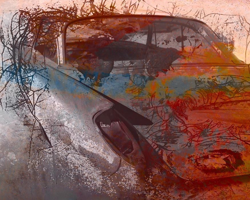 The large foreground car portrayed here connects to the human entropy theme: the confusion of late life, the body slowly failing while something still flickers. A red tail light glows against the consuming rust and decay — a light still on inside a wasting body, refusing to go out.