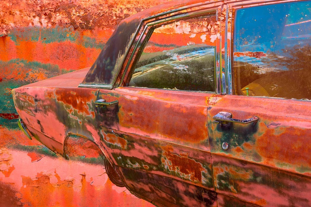 The new one of the bunch, with the source image being taken during a recent trip to Arizona. This VW van has clearly lost the war with time, rust claiming everything. But the image doesn’t mourn it. There’s a warmth and dignity to the wreckage. Defeated, yes — but not forgotten.