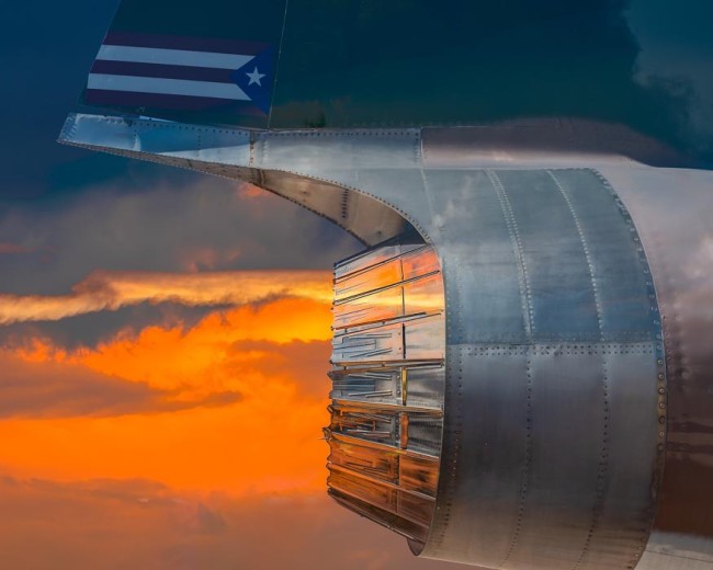 Here the reflective background texture from the previous image is replaced by a background sky where the alignment of the cloud formation again mimics a fuel emission from the jet tail. In this case, the illusion is even stronger, thanks to the orange and yellow glow in the clouds. Like the earlier version, the result walks a line between assertive energy and quiet meditation.